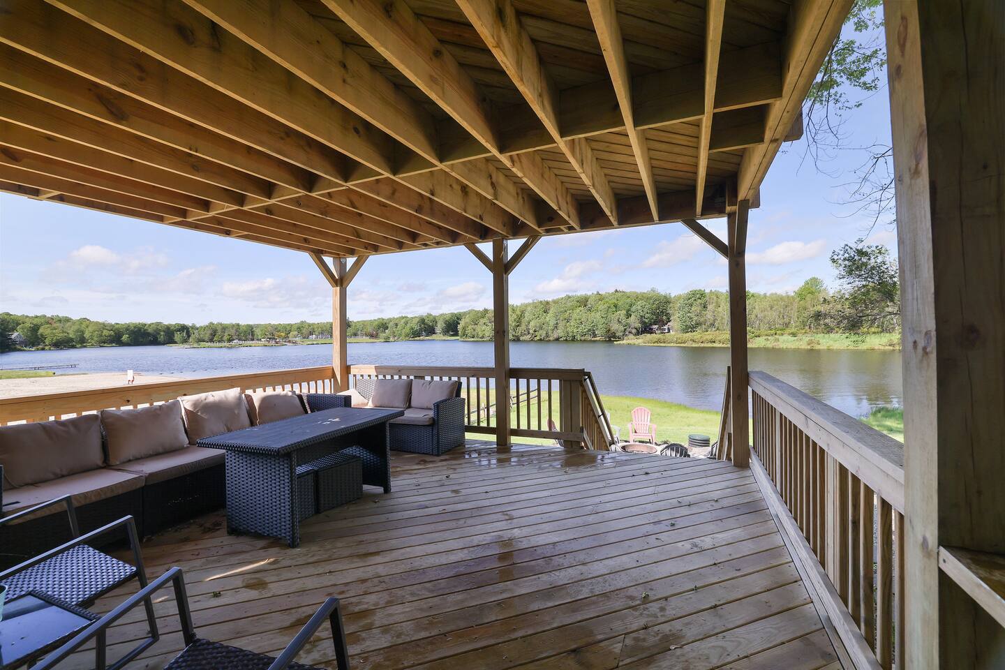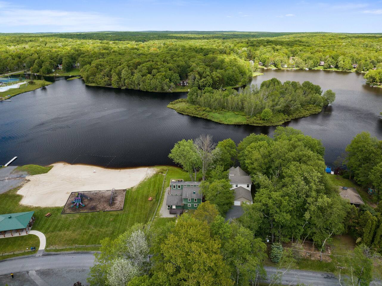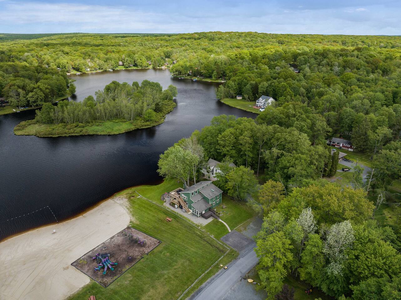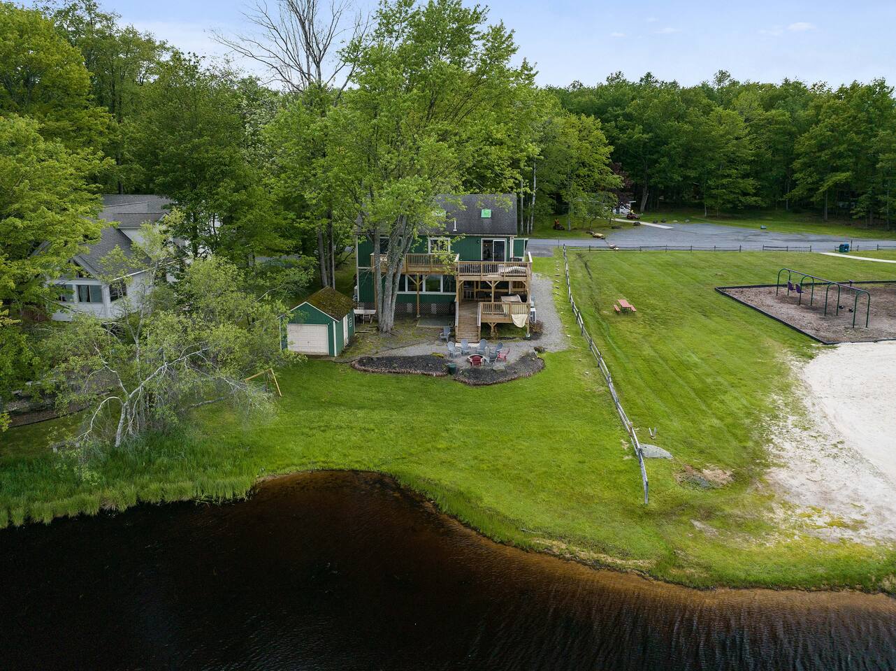 Gorgeous Lakefront Lodge Winter/Summer Home in Lake Arrowhead! 4 bedrooms including a bunk room that’s great for all the kids. Purchased in September 2022 and lovingly renovated and restored. We’ve updated the property with brand new 2-story deck, new patio furniture, new first floor flooring, sauna, new ductless heating/AC, updated landscaping, added arcade & digital pinball machine (25+ tables), added mountain theme decor, added lawn swing by the lake, upgraded the WiFi to enterprise class with multiple access points (no dead spots and blazing fast for 75+ devices), upgraded all TVs to smart TVs with Hulu, Netflix, and Amazon Prime. This mid-century beauty is ideally located on the lake right next to a community beach and playground. In addition to its own private beach and lake access, it’s only a quick swim or kayak ride across the lake to the Island Pool complex, one of three heated pools in the community. 4 bedrooms and 3.5 bathrooms make this an ideal place for extended family get-togethers. On the first floor is the kitchen, dining area, game room, 1.5 baths, 2 bedrooms and a laundry room. The kitchen is fully equipped with all the basic cookware, stove, oven, and an over-the-range microwave. Our dining areas include 2 6’ tables with seating for 6 and even more tables and seating outside on the screened in porch and deck. The library and game room with its breathtaking view of the lake is the perfect hangout spot with pool table, beverage fridge, bar, a 55' LCD TV, a library of books, and board games. Arcade Legends Ultimate Pinball machine is set up for free play and includes over 25+ pinball tables and 100s+ of your all-time favorite and classic arcade games, including Mortal Kombat, Pac man, Mrs. Pac Man, Centipede, Asteroids, Street Fighter, X-Men, and many more. Located on the second floor is the cozy living room that has a cathedral ceiling, a 65 ' LCD TV and a sliding door out onto the 2nd story deck that features gorgeous views of the lake, a propane fire, and tons of seating. Down the hall is another bathroom, a Sauna, a bunk room that can easily sleep 6+ kids and is great for families, and a massive primary bedroom and suite that has a sliding door out onto the deck and a huge 80’ LCD TV. Our home sits on Lake Arrowhead, a private lake that permits fishing, swimming, and kayaking. We are right next to community beach #3 which has a swimming area, picnic tables, pavilion, boat launch, playground, and bathroom facilities. Tennis, Pickleball and Basketball Courts are available to use in the neighborhood along with 3 Outdoor pools, Playgrounds, 4 Beaches with snack shacks and more. Hike the beautiful trails of Hickory Run State Park and Austin Blakeslee Natural Area both just a few miles away. Come to Stagshead any time of the year and you’ll find a wide range of fun activities no matter your interests. Other local attractions include Pocono Raceway, historic Jim Thorpe, Aquatopia, Great Wolf Lodge, Kalahari Indoor Waterpark, Montage Ski Resort, and Split Rock resorts. Other activities nearby include snowmobiling, horseback riding, paintball, hiking, white water rafting, fishing, hunting, miniature golf, water parks, casino gambling, bowling, movie theater, multiple golf courses, and shopping. Township Registration #020402. Minimum Age to Rent in Tobyhanna Township is 25.