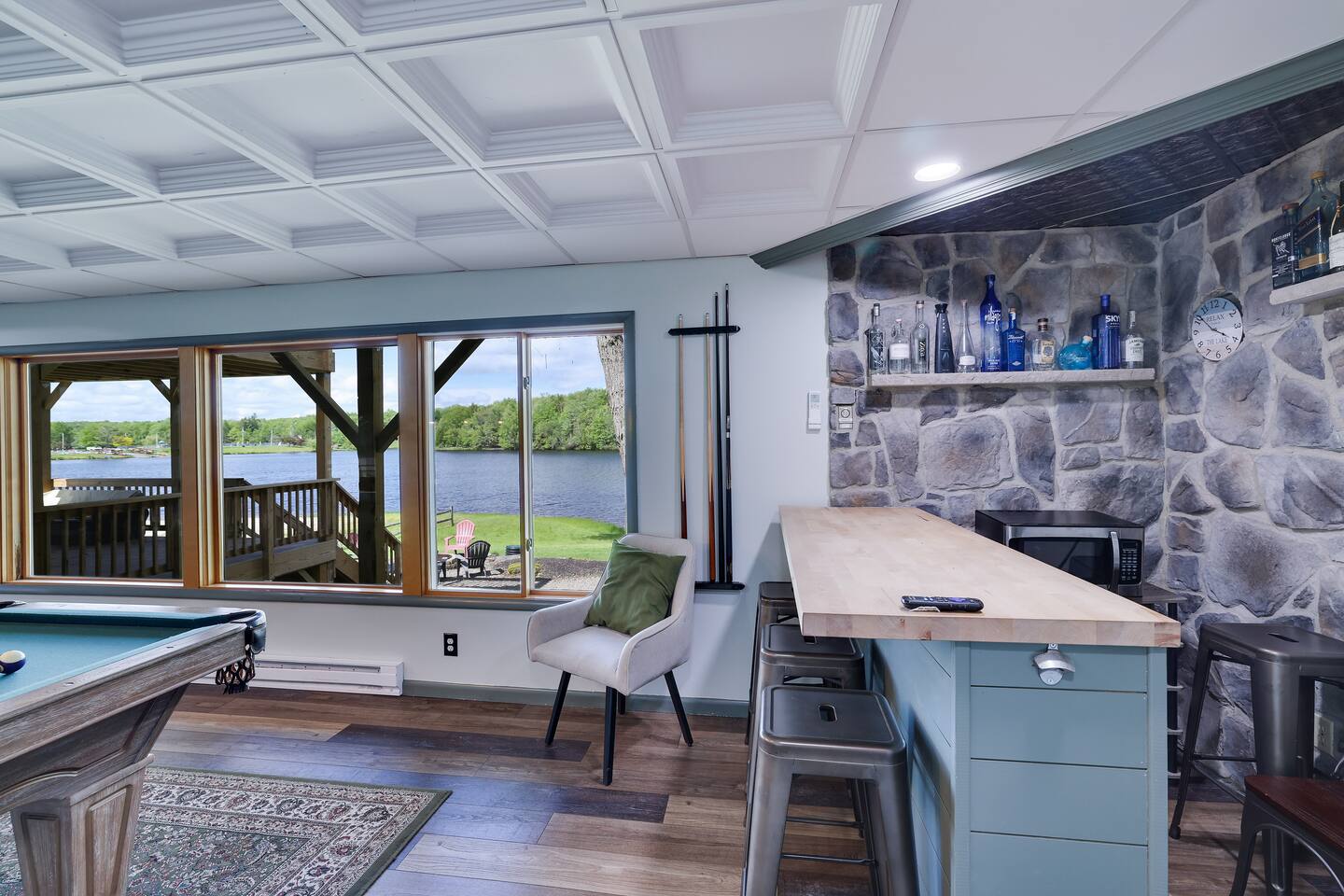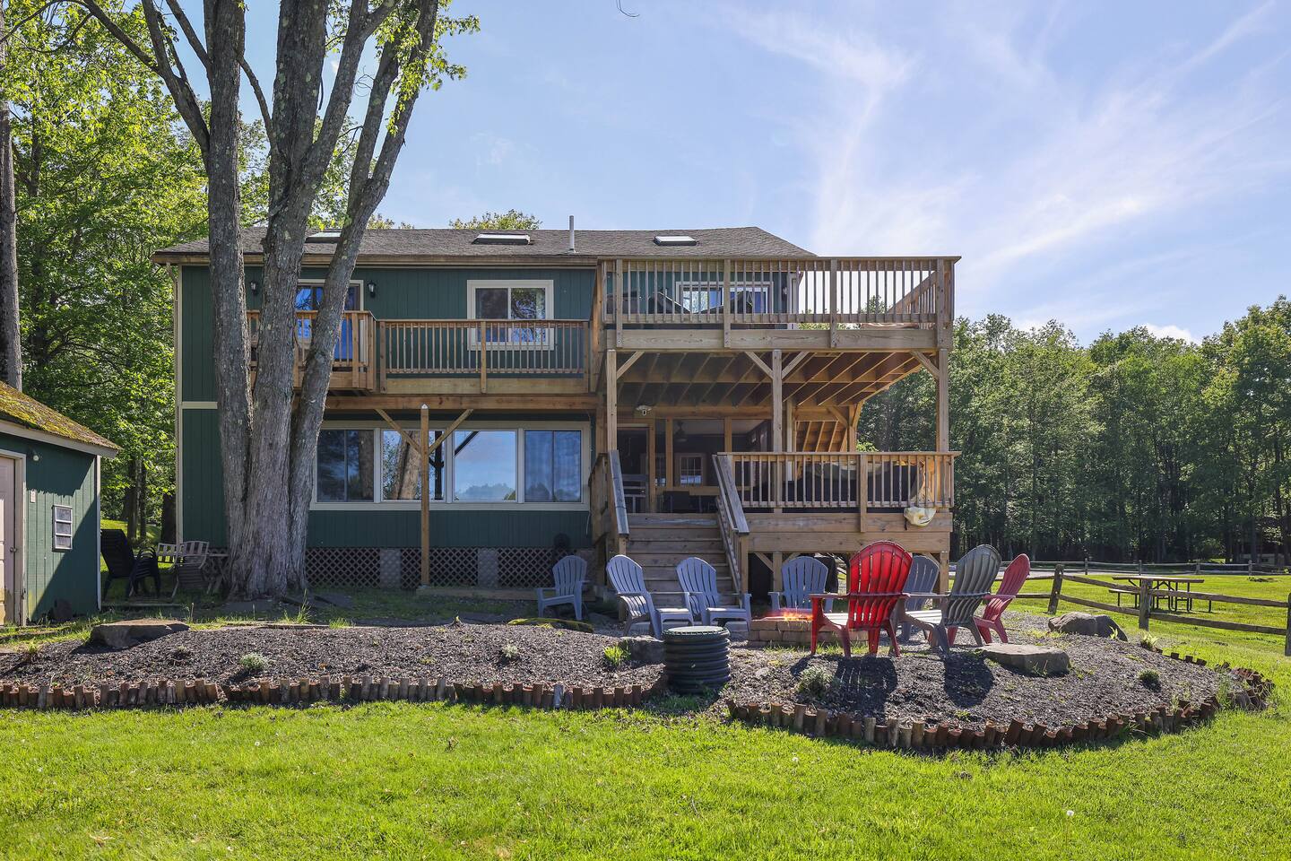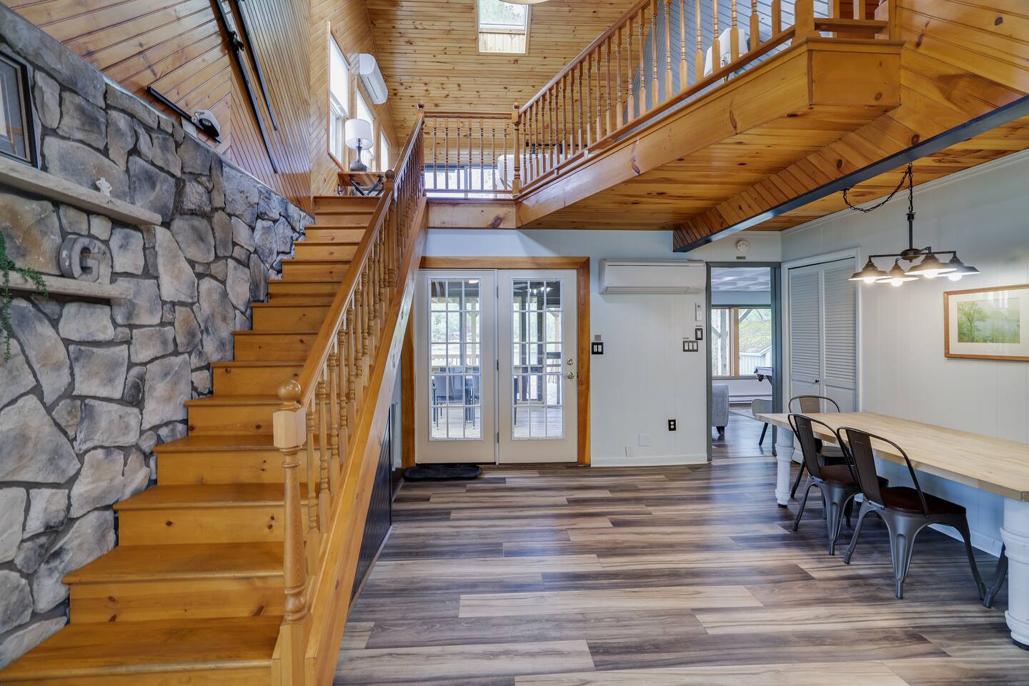 Gorgeous Lakefront Lodge Winter/Summer Home in Lake Arrowhead! 4 bedrooms including a bunk room that’s great for all the kids. Purchased in September 2022 and lovingly renovated and restored. We’ve updated the property with brand new 2-story deck, new patio furniture, new first floor flooring, sauna, new ductless heating/AC, updated landscaping, added arcade & digital pinball machine (25+ tables), added mountain theme decor, added lawn swing by the lake, upgraded the WiFi to enterprise class with multiple access points (no dead spots and blazing fast for 75+ devices), upgraded all TVs to smart TVs with Hulu, Netflix, and Amazon Prime. This mid-century beauty is ideally located on the lake right next to a community beach and playground. In addition to its own private beach and lake access, it’s only a quick swim or kayak ride across the lake to the Island Pool complex, one of three heated pools in the community. 4 bedrooms and 3.5 bathrooms make this an ideal place for extended family get-togethers. On the first floor is the kitchen, dining area, game room, 1.5 baths, 2 bedrooms and a laundry room. The kitchen is fully equipped with all the basic cookware, stove, oven, and an over-the-range microwave. Our dining areas include 2 6’ tables with seating for 6 and even more tables and seating outside on the screened in porch and deck. The library and game room with its breathtaking view of the lake is the perfect hangout spot with pool table, beverage fridge, bar, a 55' LCD TV, a library of books, and board games. Arcade Legends Ultimate Pinball machine is set up for free play and includes over 25+ pinball tables and 100s+ of your all-time favorite and classic arcade games, including Mortal Kombat, Pac man, Mrs. Pac Man, Centipede, Asteroids, Street Fighter, X-Men, and many more. Located on the second floor is the cozy living room that has a cathedral ceiling, a 65 ' LCD TV and a sliding door out onto the 2nd story deck that features gorgeous views of the lake, a propane fire, and tons of seating. Down the hall is another bathroom, a Sauna, a bunk room that can easily sleep 6+ kids and is great for families, and a massive primary bedroom and suite that has a sliding door out onto the deck and a huge 80’ LCD TV. Our home sits on Lake Arrowhead, a private lake that permits fishing, swimming, and kayaking. We are right next to community beach #3 which has a swimming area, picnic tables, pavilion, boat launch, playground, and bathroom facilities. Tennis, Pickleball and Basketball Courts are available to use in the neighborhood along with 3 Outdoor pools, Playgrounds, 4 Beaches with snack shacks and more. Hike the beautiful trails of Hickory Run State Park and Austin Blakeslee Natural Area both just a few miles away. Come to Stagshead any time of the year and you’ll find a wide range of fun activities no matter your interests. Other local attractions include Pocono Raceway, historic Jim Thorpe, Aquatopia, Great Wolf Lodge, Kalahari Indoor Waterpark, Montage Ski Resort, and Split Rock resorts. Other activities nearby include snowmobiling, horseback riding, paintball, hiking, white water rafting, fishing, hunting, miniature golf, water parks, casino gambling, bowling, movie theater, multiple golf courses, and shopping. Township Registration #020402. Minimum Age to Rent in Tobyhanna Township is 25.